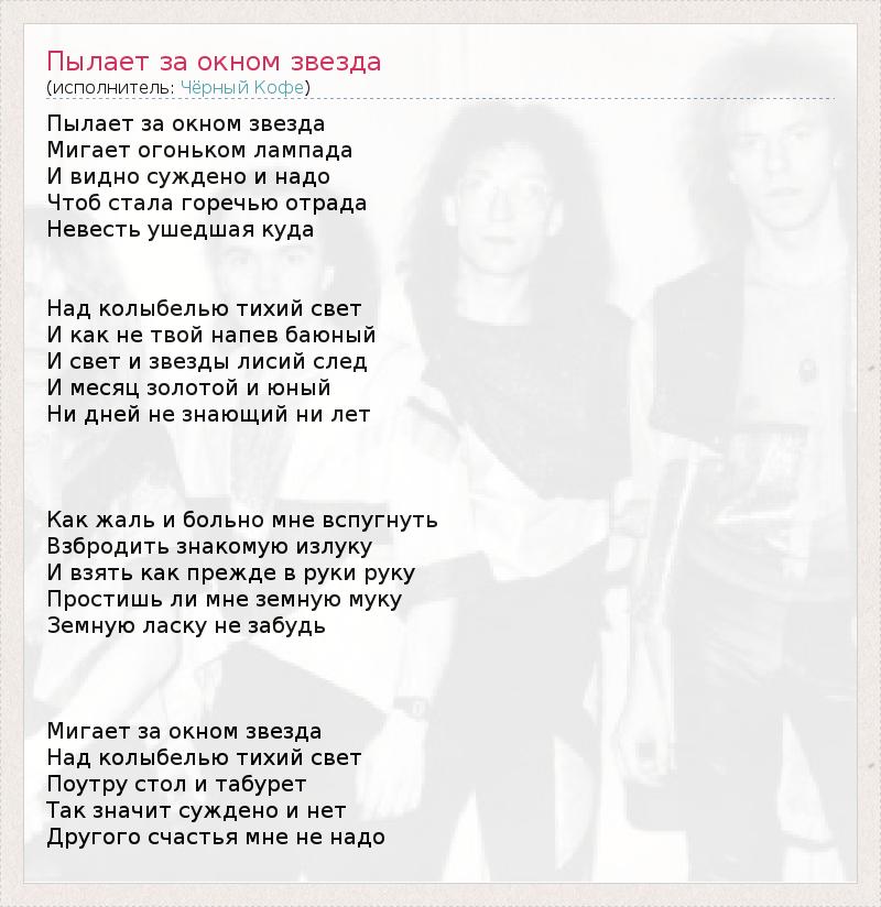 Пылает за окном звезда Мигает огоньком лампада И видно суждено и надо Чтоб стала горечью отрада Невесть ушедшая куда Над колыбелью тихий свет И как не твой напев баюный И свет и звезды лисий след И месяц золотой и юный Ни дней не знающий ни лет Как жаль и больно мне вспугнуть Взбродить знакомую излуку И взять как прежде в руки руку Простишь ли мне земную муку Земную ласку не забудь Мигает за окном звезда Над колыбелью тихий свет Поутру стол и табурет Так значит суждено и нет Другого счастья мне не надо