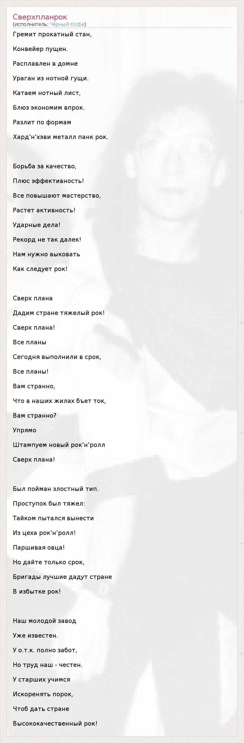 Это интересно:Основатель, вокалист, и гитарист группы — Дмитрий Варшавский. Первой широкой аудиторией «Чёрного Кофе» были военнослужащие. После тура по воинским частям группа попала в список запрещенных рок-коллективов, хотя на практике ее концерты (в отличие, например, от выступлений ДДТ), не запрещали. Первая запись группы была... продолжение