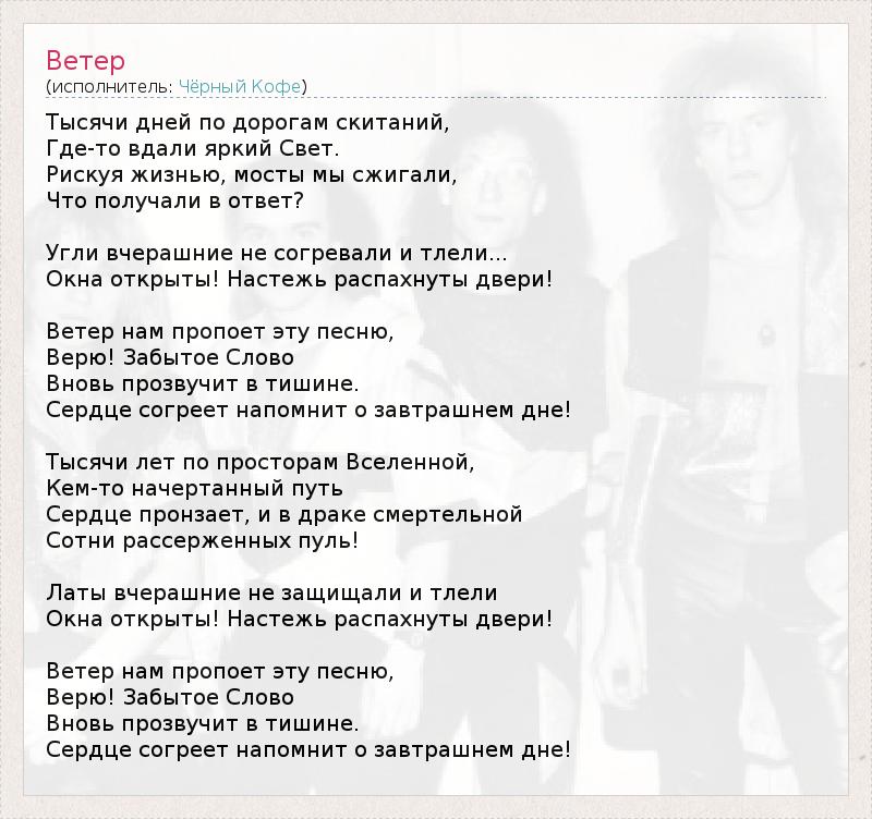 Это интересно:Основатель, вокалист, и гитарист группы — Дмитрий Варшавский. Первой широкой аудиторией «Чёрного Кофе» были военнослужащие. После тура по воинским частям группа попала в список запрещенных рок-коллективов, хотя на практике ее концерты (в отличие, например, от выступлений ДДТ), не запрещали. Первая запись группы была... продолжение