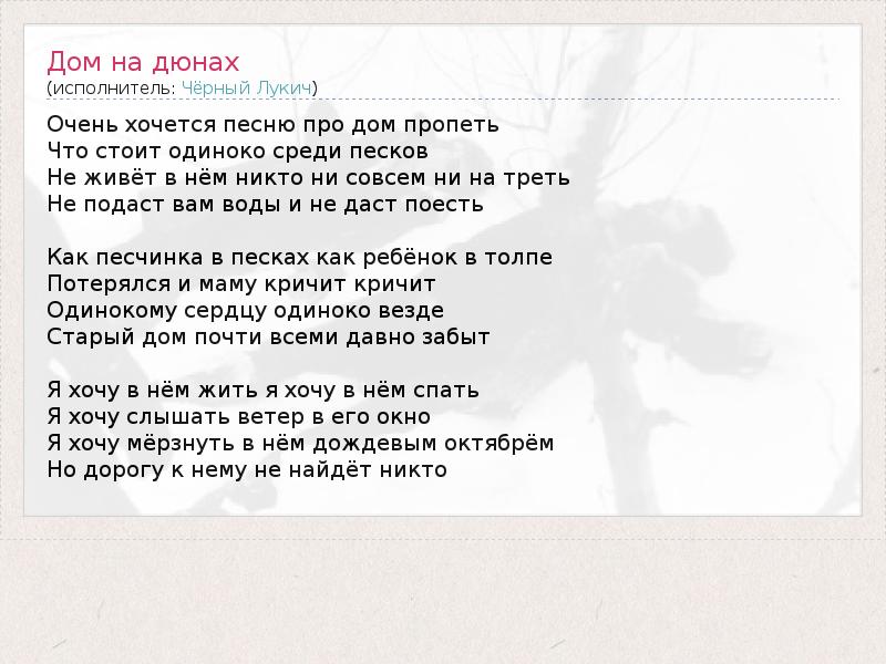 Очень хочется песню про дом пропеть Что стоит одиноко среди песков Не живёт в нём никто ни совсем ни на треть Не подаст вам воды и не даст поесть Как песчинка в песках как ребёнок в толпе Потерялся и маму кричит кричит Одинокому сердцу одиноко везде Старый дом почти всеми давно забыт Я хочу в нём жить я хочу в нём спать Я хочу слышать ветер в его окно Я хочу мёрзнуть в нём дождевым октябрём Но дорогу к нему не найдёт никто