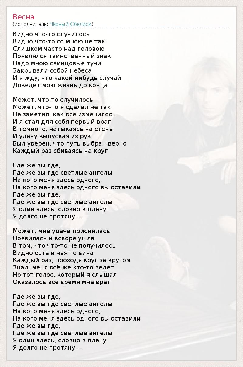 Черный Обелиск - Ангелы http://megalyrics.ru/lyric/%D1%87%D0%B5%D1%80%D0%BD%D1%8B%D0%B9-%D0%BE%D0%B1%D0%B5%D0%BB%D0%B8%D1%81%D0%BA/%D0%B0%D0%BD%D0%B3%D0%B5%D0%BB%D1%8B.htm#ixzz1xNRo5Fsk