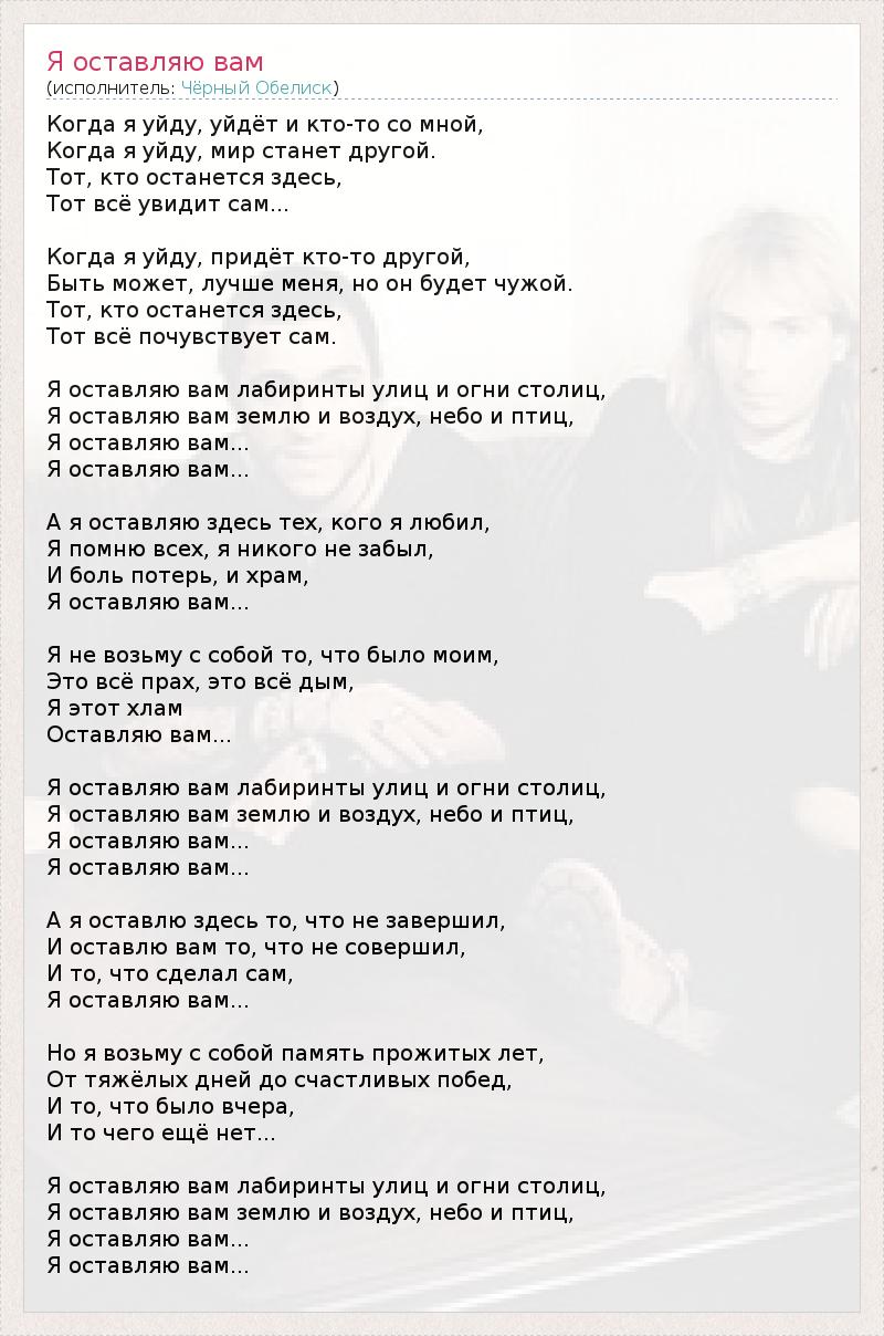 Когда я уйду, уйдёт и кто-то со мной, Когда я уйду, мир станет другой. Тот, кто останется здесь, Тот всё увидит сам... Когда я уйду, придёт кто-то другой, Быть может, лучше меня, но он будет чужой. Тот, кто останется здесь, Тот всё почувствует сам. Я оставляю вам лабиринты улиц и огни столиц, Я оставляю вам землю и воздух, небо и птиц, Я оставляю вам... Я оставляю вам... А я оставляю здесь тех, кого я любил, Я помню всех, я никого не забыл, И боль потерь, и храм, Я оставляю вам... Я не возьму с собой то, что было моим, Это всё прах, это всё дым, Я этот хлам Оставляю вам... Я оставляю вам лабиринты улиц и огни столиц, Я оставляю вам землю и воздух, небо и птиц, Я оставляю вам... Я оставляю вам... А я оставлю здесь то, что не завершил, И оставлю вам то, что не совершил, И то, что сделал сам, Я оставляю вам... Но я возьму с собой память прожитых лет, От тяжёлых дней до счастливых побед, И то, что было вчера, И то чего ещё нет... Я оставляю вам лабиринты улиц и огни столиц, Я оставляю вам землю и воздух, небо и птиц, Я оставляю вам... Я оставляю вам...