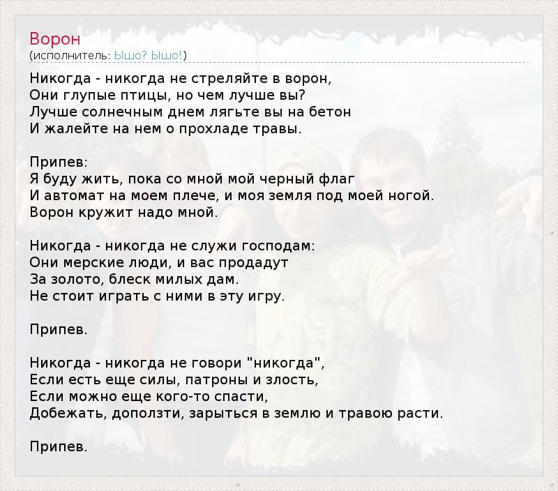 Никогда - никогда не стреляйте в ворон, Они глупые птицы, но чем лучше вы? Лучше солнечным днем лягьте вы на бетон И жалейте на нем о прохладе травы. Припев: Я буду жить, пока со мной мой черный флаг И автомат на моем плече, и моя земля под моей ногой. Ворон кружит надо мной. Никогда - никогда не служи господам: Они мерские люди, и вас продадут За золото, блеск милых дам. Не стоит играть с ними в эту игру. Припев. Никогда - никогда не говори "никогда", Если есть еще силы, патроны и злость, Если можно еще кого-то спасти, Добежать, доползти, зарыться в землю и травою расти. Припев.