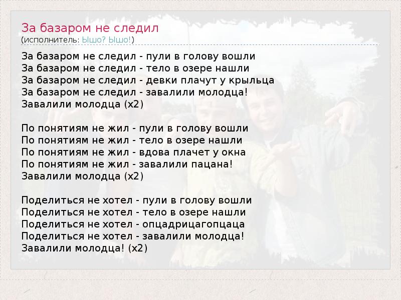За базаром не следил - пули в голову вошли За базаром не следил - тело в озере нашли За базаром не следил - девки плачут у крыльца За базаром не следил - завалили молодца! Завалили молодца (x2) По понятиям не жил - пули в голову вошли По понятиям не жил - тело в озере нашли По понятиям не жил - вдова плачет у окна По понятиям не жил - завалили пацана! Завалили молодца (x2) Поделиться не хотел - пули в голову вошли Поделиться не хотел - тело в озере нашли Поделиться не хотел - опцадрицагопцаца Поделиться не хотел - завалили молодца! Завалили молодца! (x2)