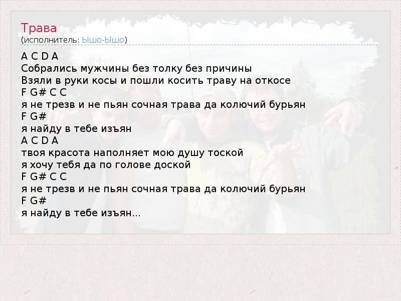 A C D A Собрались мужчины без толку без причины Взяли в руки косы и пошли косить траву на откосе F G# C C я не трезв и не пьян сочная трава да колючий бурьян F G# я найду в тебе изъян A C D A твоя красота наполняет мою душу тоской я хочу тебя да по голове доской F G# C C я не трезв и не пьян сочная трава да колючий бурьян F G# я найду в тебе изъян...