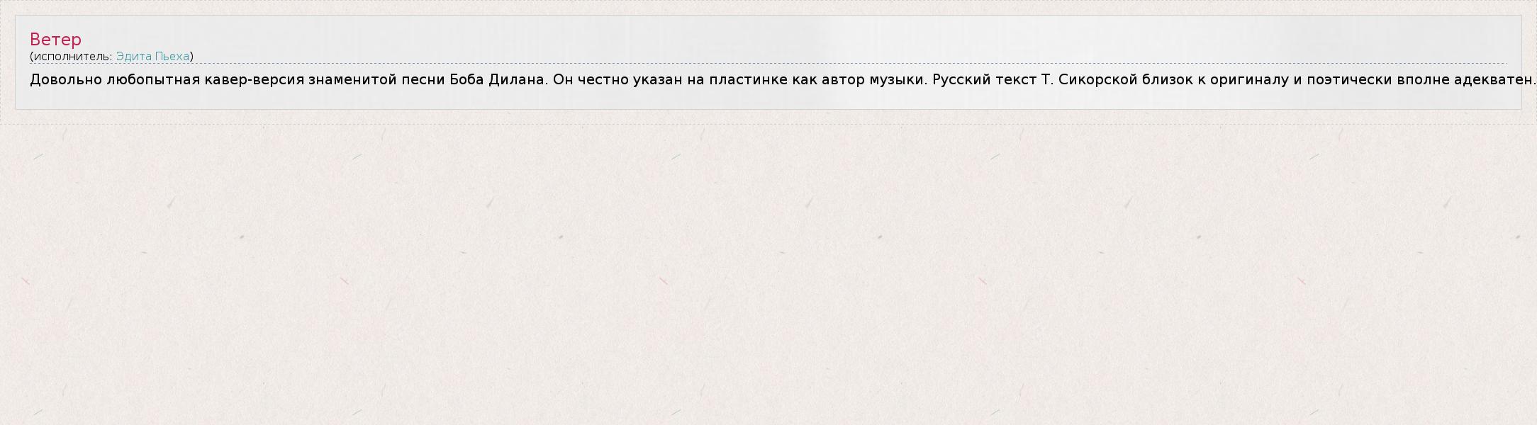 Довольно любопытная кавер-версия знаменитой песни Боба Дилана. Он честно указан на пластинке как автор музыки. Русский текст Т. Сикорской близок к оригиналу и поэтически вполне адекватен.