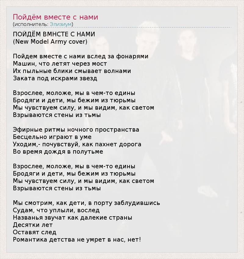 ПОЙДЁМ ВМНСТЕ С НАМИ (New Model Army cover) Пойдем вместе с нами вслед за фонарями Машин, что летят через мост Их пыльные блики смывает волнами Заката под искрами звезд Взрослее, моложе, мы в чем-то едины Бродяги и дети, мы бежим из тюрьмы Мы чувствуем силу, и мы видим, как светом Взрываются стены из тьмы Эфирные ритмы ночного пространства Бесцельно играют в уме Уходим,- почувствуй, как пахнет дорога Во время дождя в полутьме Взрослее, моложе, мы в чем-то едины Бродяги и дети, мы бежим из тюрьмы Мы чувствуем силу, и мы видим, как светом Взрываются стены из тьмы Мы смотрим, как дети, в порту заблудившись Судам, что уплыли, вослед Названья звучат как далекие страны Десятки лет Оставят след Романтика детства не умрет в нас, нет!