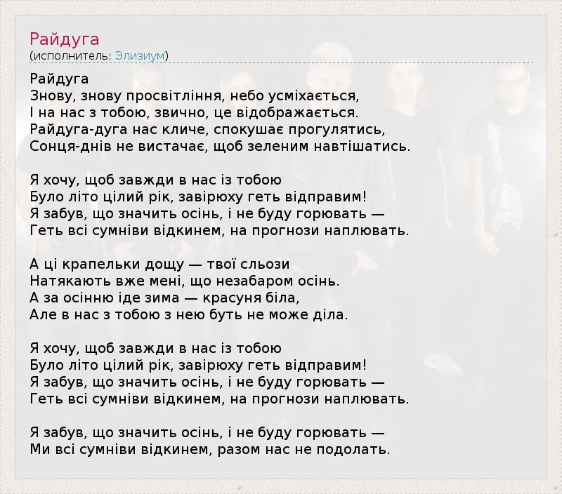 Райдуга Знову, знову просвітління, небо усміхається, І на нас з тобою, звично, це відображається. Райдуга-дуга нас кличе, спокушає прогулятись, Сонця-днів не вистачає, щоб зеленим навтішатись. Я хочу, щоб завжди в нас із тобою Було літо цілий рік, завірюху геть відправим! Я забув, що значить осінь, і не буду горювать — Геть всі сумніви відкинем, на прогнози наплювать. А ці крапельки дощу — твої сльози Натякають вже мені, що незабаром осінь. А за осінню іде зима — красуня біла, Але в нас з тобою з нею буть не може діла. Я хочу, щоб завжди в нас із тобою Було літо цілий рік, завірюху геть відправим! Я забув, що значить осінь, і не буду горювать — Геть всі сумніви відкинем, на прогнози наплювать. Я забув, що значить осінь, і не буду горювать — Ми всі сумніви відкинем, разом нас не подолать.