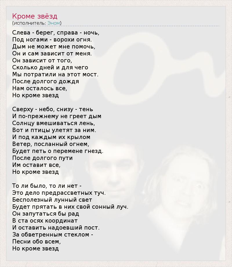 Слева - берег, справа - ночь, Под ногами - ворохи огня. Дым не может мне помочь, Он и сам зависит от меня. Он зависит от того, Сколько дней и для чего Мы потратили на этот мост. После долгого дождя Нам осталось все, Но кроме звезд Сверху - небо, снизу - тень И по-прежнему не греет дым Солнцу вмешиваться лень, Вот и птицы улетят за ним. И под каждым их крылом Ветер, посланный огнем, Будет петь о перемене гнезд. После долгого пути Им оставит все, Но кроме звезд То ли было, то ли нет - Это дело предрассветных туч. Бесполезный лунный свет Будет прятать в них свой сонный луч. Он запутаться бы рад В ста осях координат И оставить надоевший пост. За обветренным стеклом - Песни обо всем, Но кроме звезд