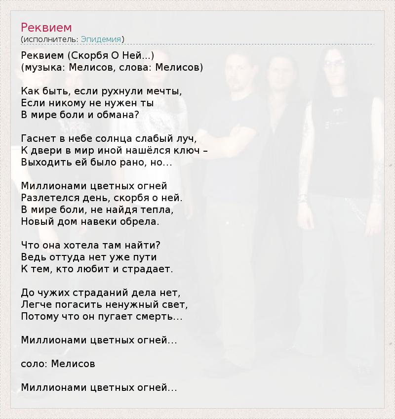 Эпидемия - Реквием http://megalyrics.ru/lyric/%D1%8D%D0%BF%D0%B8%D0%B4%D0%B5%D0%BC%D0%B8%D1%8F/%D1%80%D0%B5%D0%BA%D0%B2%D0%B8%D0%B5%D0%BC.htm#ixzz1xgAQ10lO