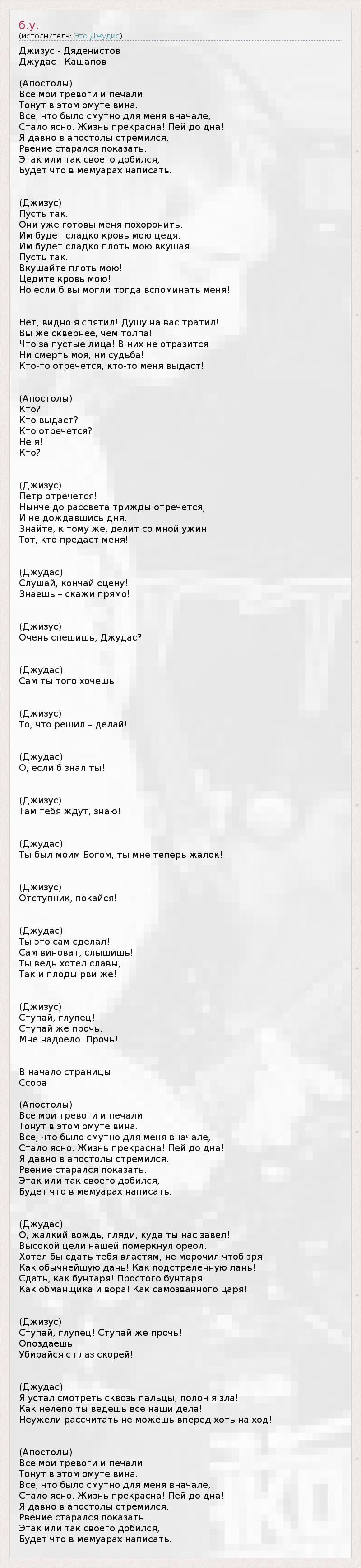 Джизус - Дяденистов Джудас - Кашапов (Апостолы) Все мои тревоги и печали Тонут в этом омуте вина. Все, что было смутно для меня вначале, Стало ясно. Жизнь прекрасна! Пей до дна! Я давно в апостолы стремился, Рвение старался показать. Этак или так своего добился, Будет что в мемуарах написать. (Джизус) Пусть так. Они уже готовы меня похоронить. Им будет сладко кровь мою цедя. Им будет сладко плоть мою вкушая. Пусть так. Вкушайте плоть мою! Цедите кровь мою! Но если б вы могли тогда вспоминать меня! Нет, видно я спятил! Душу на вас тратил! Вы же сквернее, чем толпа! Что за пустые лица! В них не отразится Ни смерть моя, ни судьба! Кто-то отречется, кто-то меня выдаст! (Апостолы) Кто? Кто выдаст? Кто отречется? Не я! Кто? (Джизус) Петр отречется! Нынче до рассвета трижды отречется, И не дождавшись дня. Знайте, к тому же, делит со мной ужин Тот, кто предаст меня! (Джудас) Слушай, кончай сцену! Знаешь – скажи прямо! (Джизус) Очень спешишь, Джудас? (Джудас) Сам ты того хочешь! (Джизус) То, что решил – делай! (Джудас) О, если б знал ты! (Джизус) Там тебя ждут, знаю! (Джудас) Ты был моим Богом, ты мне теперь жалок! (Джизус) Отступник, покайся! (Джудас) Ты это сам сделал! Сам виноват, слышишь! Ты ведь хотел славы, Так и плоды рви же! (Джизус) Ступай, глупец! Ступай же прочь. Мне надоело. Прочь! В начало страницы Ссора (Апостолы) Все мои тревоги и печали Тонут в этом омуте вина. Все, что было смутно для меня вначале, Стало ясно. Жизнь прекрасна! Пей до дна! Я давно в апостолы стремился, Рвение старался показать. Этак или так своего добился, Будет что в мемуарах написать. (Джудас) О, жалкий вождь, гляди, куда ты нас завел! Высокой цели нашей померкнул ореол. Хотел бы сдать тебя властям, не морочил чтоб зря! Как обычнейшую дань! Как подстреленную лань! Сдать, как бунтаря! Простого бунтаря! Как обманщика и вора! Как самозванного царя! (Джизус) Ступай, глупец! Ступай же прочь! Опоздаешь. Убирайся с глаз скорей! (Джудас) Я устал смотреть сквозь пальцы, полон я зла! Как нелепо ты ведешь все наши дела! Неужели рассчитать не можешь вперед хоть на ход! (Апостолы) Все мои тревоги и печали Тонут в этом омуте вина. Все, что было смутно для меня вначале, Стало ясно. Жизнь прекрасна! Пей до дна! Я давно в апостолы стремился, Рвение старался показать. Этак или так своего добился, Будет что в мемуарах написать.