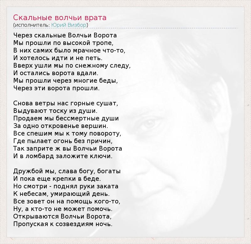 Через скальные Волчьи Ворота Мы прошли по высокой тропе, В них самих было мрачное что-то, И хотелось идти и не петь. Вверх ушли мы по снежному следу, И остались ворота вдали. Мы прошли через многие беды, Через эти ворота прошли. Снова ветры нас горные сушат, Выдувают тоску из души. Продаем мы бессмертные души За одно откровенье вершин. Все спешим мы к тому повороту, Где пылает огонь без причин, Так заприте ж вы Волчьи Ворота И в ломбард заложите ключи. Дружбой мы, слава богу, богаты И пока еще крепки в беде. Но смотри - поднял руки заката К небесам, умирающий день. Все зовет он на помощь кого-то, Ну, а кто-то не может помочь. Открываются Волчьи Ворота, Пропуская к созвездиям ночь.
