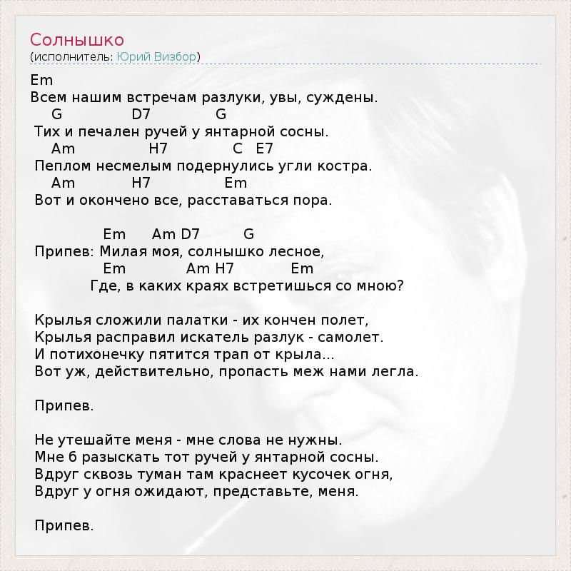 Это интересно:БиографияРанние годыЮрий Визбор родился 20 июня 1934 в Москве, в семье командира Красной Армии. Вот фрагмент автобиографии поэта: «Я родился по недосмотру 20 июня 1934 года, в Москве, в родильном доме им. Крупской, что на Миуссах. Моя двадцатилетняя к тому времени матушка Мария Шевченко, привезённая в Москву из Краснодара молодым, вспыльчивым и ревнивым командиром, бывшим моряком, устремившимся... продолжение