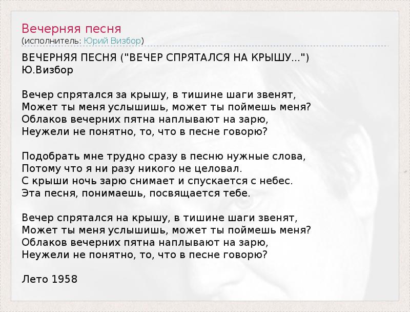 ВЕЧЕРНЯЯ ПЕСНЯ ("ВЕЧЕР СПРЯТАЛСЯ НА КРЫШУ...")