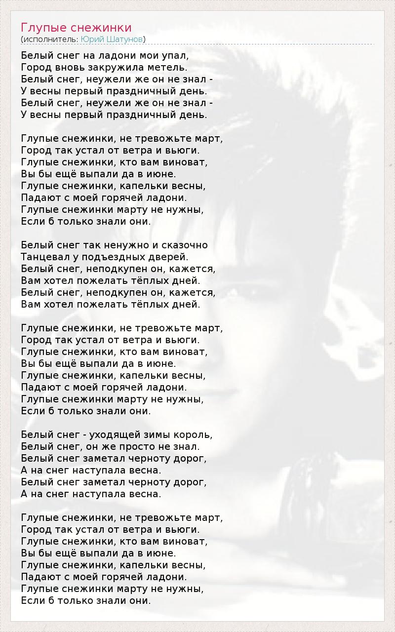 Белый снег на ладони мои упал, Город вновь закружила метель. Белый снег, неужели же он не знал - У весны первый праздничный день. Белый снег, неужели же он не знал - У весны первый праздничный день. Глупые снежинки, не тревожьте март, Город так устал от ветра и вьюги. Глупые снежинки, кто вам виноват, Вы бы ещё выпали да в июне. Глупые снежинки, капельки весны, Падают с моей горячей ладони. Глупые снежинки марту не нужны, Если б только знали они. Белый снег так ненужно и сказочно Танцевал у подъездных дверей. Белый снег, неподкупен он, кажется, Вам хотел пожелать тёплых дней. Белый снег, неподкупен он, кажется, Вам хотел пожелать тёплых дней. Глупые снежинки, не тревожьте март, Город так устал от ветра и вьюги. Глупые снежинки, кто вам виноват, Вы бы ещё выпали да в июне. Глупые снежинки, капельки весны, Падают с моей горячей ладони. Глупые снежинки марту не нужны, Если б только знали они. Белый снег - уходящей зимы король, Белый снег, он же просто не знал. Белый снег заметал черноту дорог, А на снег наступала весна. Белый снег заметал черноту дорог, А на снег наступала весна. Глупые снежинки, не тревожьте март, Город так устал от ветра и вьюги. Глупые снежинки, кто вам виноват, Вы бы ещё выпали да в июне. Глупые снежинки, капельки весны, Падают с моей горячей ладони. Глупые снежинки марту не нужны, Если б только знали они.