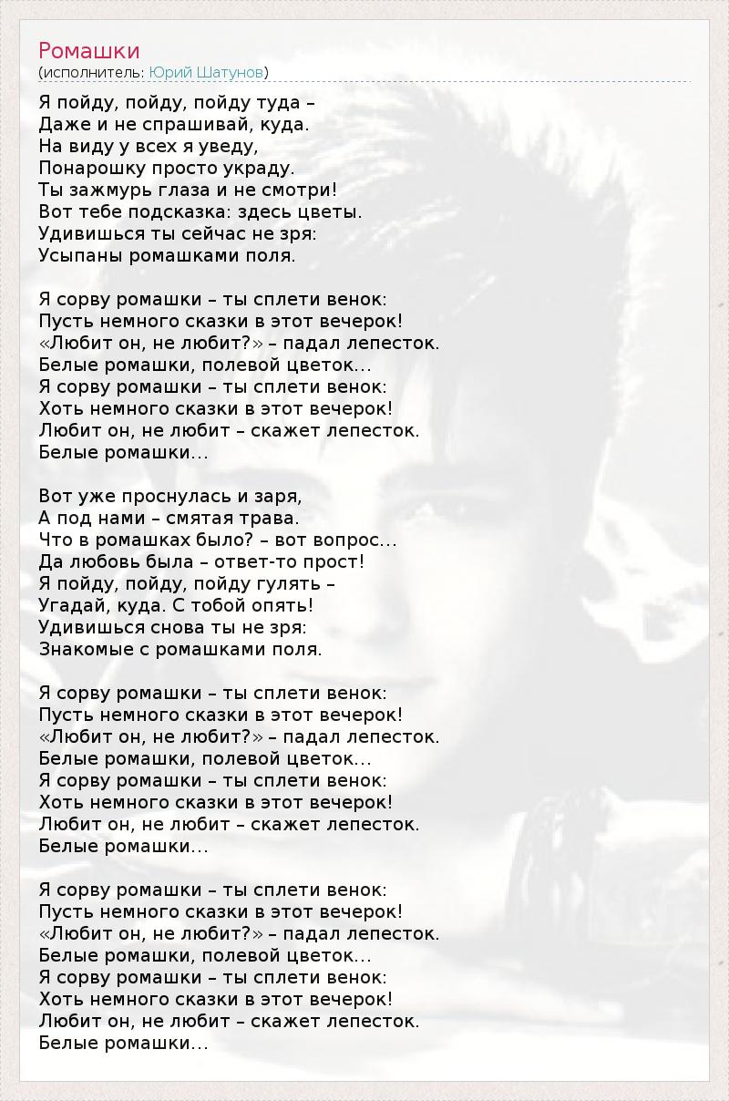 Я пойду, пойду, пойду туда – Даже и не спрашивай, куда. На виду у всех я уведу, Понарошку просто украду. Ты зажмурь глаза и не смотри! Вот тебе подсказка: здесь цветы. Удивишься ты сейчас не зря: Усыпаны ромашками поля. Я сорву ромашки – ты сплети венок: Пусть немного сказки в этот вечерок! «Любит он, не любит?» – падал лепесток. Белые ромашки, полевой цветок… Я сорву ромашки – ты сплети венок: Хоть немного сказки в этот вечерок! Любит он, не любит – скажет лепесток. Белые ромашки… Вот уже проснулась и заря, А под нами – смятая трава. Что в ромашках было? – вот вопрос… Да любовь была – ответ-то прост! Я пойду, пойду, пойду гулять – Угадай, куда. С тобой опять! Удивишься снова ты не зря: Знакомые с ромашками поля. Я сорву ромашки – ты сплети венок: Пусть немного сказки в этот вечерок! «Любит он, не любит?» – падал лепесток. Белые ромашки, полевой цветок… Я сорву ромашки – ты сплети венок: Хоть немного сказки в этот вечерок! Любит он, не любит – скажет лепесток. Белые ромашки… Я сорву ромашки – ты сплети венок: Пусть немного сказки в этот вечерок! «Любит он, не любит?» – падал лепесток. Белые ромашки, полевой цветок… Я сорву ромашки – ты сплети венок: Хоть немного сказки в этот вечерок! Любит он, не любит – скажет лепесток. Белые ромашки…