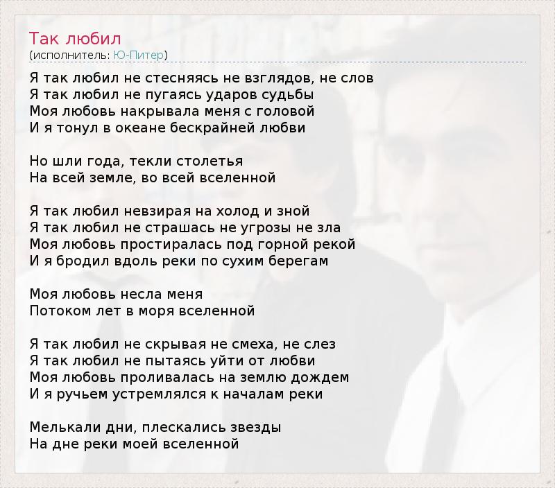 Я так любил не стесняясь не взглядов, не слов Я так любил не пугаясь ударов судьбы Моя любовь накрывала меня с головой И я тонул в океане бескрайней любви Но шли года, текли столетья На всей земле, во всей вселенной Я так любил невзирая на холод и зной Я так любил не страшась не угрозы не зла Моя любовь простиралась под горной рекой И я бродил вдоль реки по сухим берегам Моя любовь несла меня Потоком лет в моря вселенной Я так любил не скрывая не смеха, не слез Я так любил не пытаясь уйти от любви Моя любовь проливалась на землю дождем И я ручьем устремлялся к началам реки Мелькали дни, плескались звезды На дне реки моей вселенной