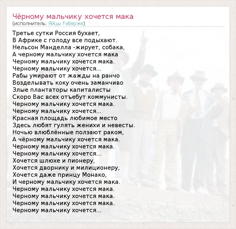 Третье сутки Россия бухает, В Африке с голоду все подыхают. Нельсон Манделла -жирует, собака, А черному мальчику хочется мака Черному мальчику хочется мака. Черному мальчику хочется... Рабы умирают от жажды на ранчо Возделывать коку очень заманчиво Злые плантаторы капиталисты Скоро Вас всех отъебут коммунисты. Черному мальчику хочется мака. Черному мальчику хочется... Красная площадь любимое место Здесь любят гулять женихи и невесты. Ночью влюблённые ползают раком, А чёрному мальчику хочется мака. Черному мальчику хочется мака. Черному мальчику хочется... Хочется шлюхе и пионеру, Хочется дворнику и милиционеру, Хочется даже принцу Монако, И черному мальчику хочется мака. Черному мальчику хочется мака. Черному мальчику хочется мака. Черному мальчику хочется мака. Черному мальчику хочется...