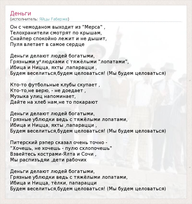 Это интересно:ЯйцЫ Fаберже — российская группа, исполняющая ска-панк. Основана в 2003 году в г. Орёл. Название группы отсылает к известным ювелирным изделиям, пасхальным яйцам Карла Фаберже. Группа наряду с обычными для рок-музыки инструментами активно использует духовые. Участник фестивалей «Нашествие» 2008—2011Состав:Нильс (вокал)Гучок (барабаны)Петя (бас, бэки)Дэн (гитара)Птица (тромбон)... продолжение