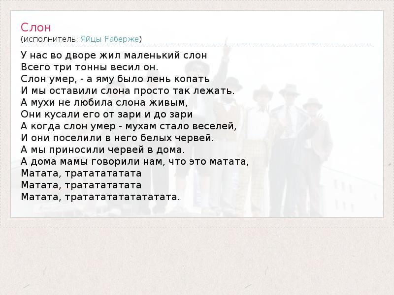 Это интересно:ЯйцЫ Fаберже — российская группа, исполняющая ска-панк. Основана в 2003 году в г. Орёл. Название группы отсылает к известным ювелирным изделиям, пасхальным яйцам Карла Фаберже. Группа наряду с обычными для рок-музыки инструментами активно использует духовые. Участник фестивалей «Нашествие» 2008—2011Состав:Нильс (вокал)Гучок (барабаны)Петя (бас, бэки)Дэн (гитара)Птица (тромбон)... продолжение