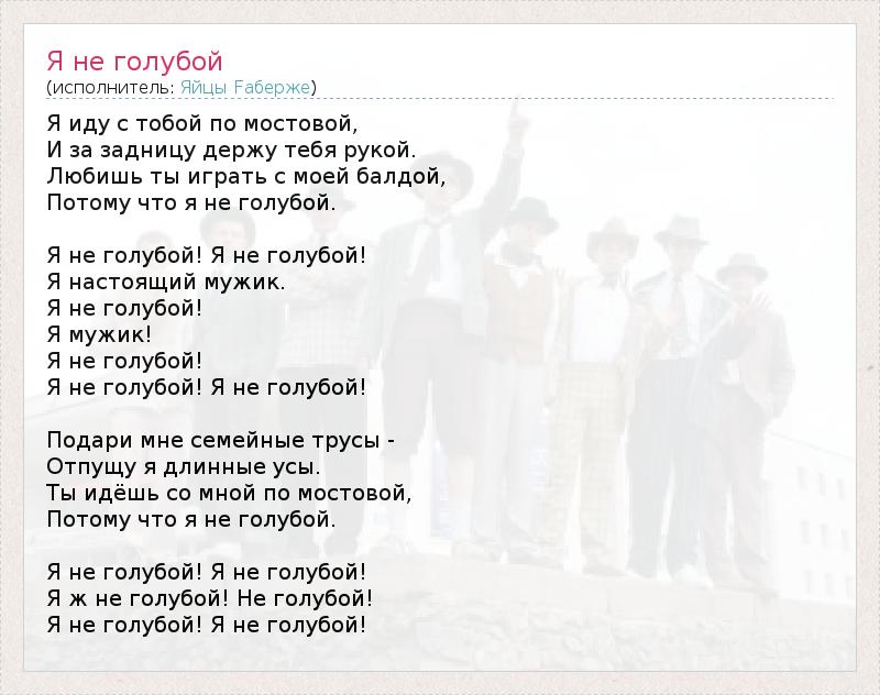 Я иду с тобой по мостовой, И за задницу держу тебя рукой. Любишь ты играть с моей балдой, Потому что я не голубой. Я не голубой! Я не голубой! Я настоящий мужик. Я не голубой! Я мужик! Я не голубой! Я не голубой! Я не голубой! Подари мне семейные трусы - Отпущу я длинные усы. Ты идёшь со мной по мостовой, Потому что я не голубой. Я не голубой! Я не голубой! Я ж не голубой! Не голубой! Я не голубой! Я не голубой!