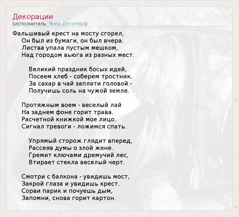 Это интересно:Яна (Янка) Станиславовна Дягилева - рок-певица, поэтесса, автор песен, участница панк-рок-групп Гражданская Оборона, Великие Октябри и др. Одна из самых ярких представителей сибирского андеграунда конца 1980-х годов. В становлении личности Янки сыграли... продолжение