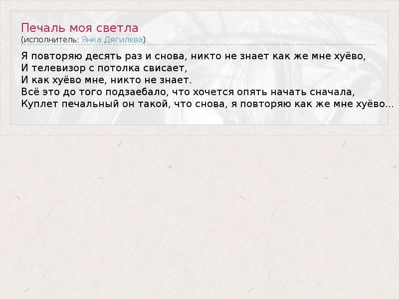 Куплет печальный он такой, что снова, я повторяю как же мне хуёво...