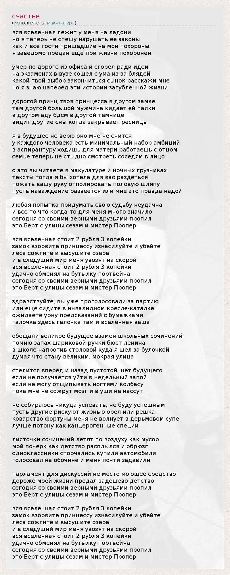 Это интересно:Сайт | VKВ январе 2003 года первокурсники кемеровского филфака, 17-летние Е. Алехин и К. Сперанский объединились в дуэт макулатура. Название позаимствовано у романа «Макулатура» Чарльза Буковски.Было решено работать в жанре приблизительно «социально-бытийный рэп», используя речитатив как рупор в работе с такими материями:... продолжение