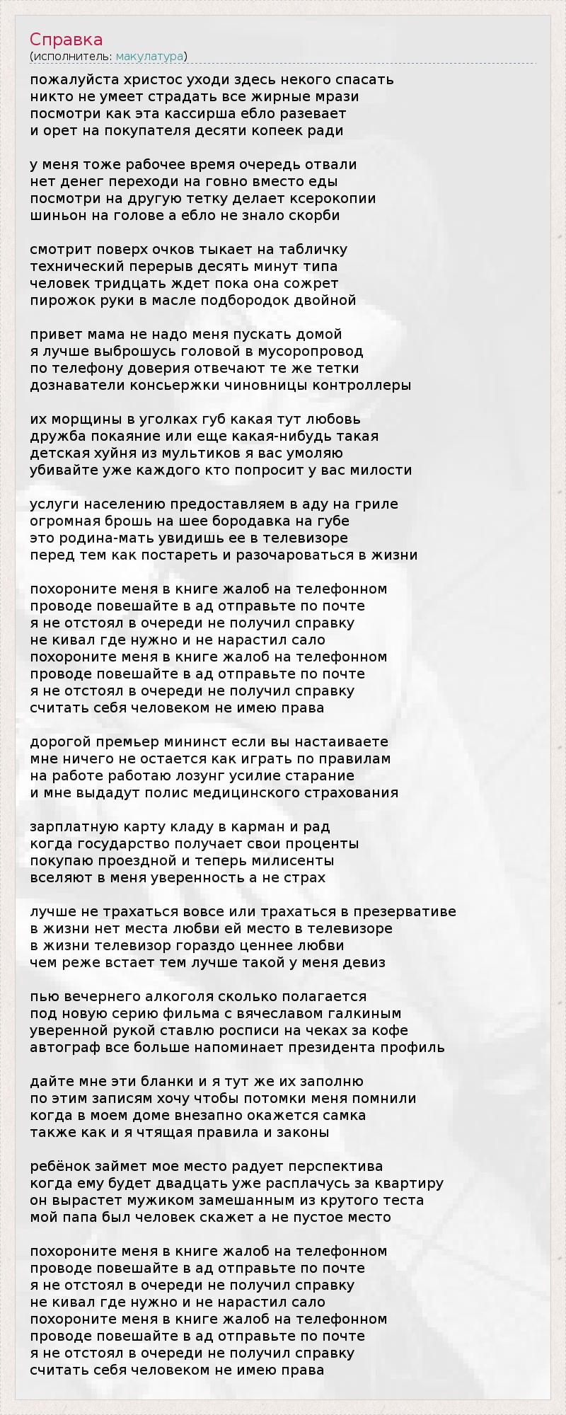 пожалуйста христос уходи здесь некого спасать никто не умеет страдать все жирные мрази посмотри как эта кассирша ебло разевает и орет на покупателя десяти копеек ради у меня тоже рабочее время очередь отвали нет денег переходи на говно вместо еды посмотри на другую тетку делает ксерокопии шиньон на голове а ебло не знало скорби смотрит поверх очков тыкает на табличку технический перерыв десять минут типа человек тридцать ждет пока она сожрет пирожок руки в масле подбородок двойной привет мама не надо меня пускать домой я лучше выброшусь головой в мусоропровод по телефону доверия отвечают те же тетки дознаватели консьержки чиновницы контроллеры их морщины в уголках губ какая тут любовь дружба покаяние или еще какая-нибудь такая детская хуйня из мультиков я вас умоляю убивайте уже каждого кто попросит у вас милости услуги населению предоставляем в аду на гриле огромная брошь на шее бородавка на губе это родина-мать увидишь ее в телевизоре перед тем как постареть и разочароваться в жизни похороните меня в книге жалоб на телефонном проводе повешайте в ад отправьте по почте я не отстоял в очереди не получил справку не кивал где нужно и не нарастил сало похороните меня в книге жалоб на телефонном проводе повешайте в ад отправьте по почте я не отстоял в очереди не получил справку считать себя человеком не имею права дорогой премьер мининст если вы настаиваете мне ничего не остается как играть по правилам на работе работаю лозунг усилие старание и мне выдадут полис медицинского страхования зарплатную карту кладу в карман и рад когда государство получает свои проценты покупаю проездной и теперь милисенты вселяют в меня уверенность а не страх лучше не трахаться вовсе или трахаться в презервативе в жизни нет места любви ей место в телевизоре в жизни телевизор гораздо ценнее любви чем реже встает тем лучше такой у меня девиз пью вечернего алкоголя сколько полагается под новую серию фильма с вячеславом галкиным уверенной рукой ставлю росписи на чеках за кофе автограф все больше напоминает президента профиль дайте мне эти бланки и я тут же их заполню по этим записям хочу чтобы потомки меня помнили когда в моем доме внезапно окажется самка также как и я чтящая правила и законы ребёнок займет мое место радует перспектива когда ему будет двадцать уже расплачусь за квартиру он вырастет мужиком замешанным из крутого теста мой папа был человек скажет а не пустое место похороните меня в книге жалоб на телефонном проводе повешайте в ад отправьте по почте я не отстоял в очереди не получил справку не кивал где нужно и не нарастил сало похороните меня в книге жалоб на телефонном проводе повешайте в ад отправьте по почте я не отстоял в очереди не получил справку считать себя человеком не имею права