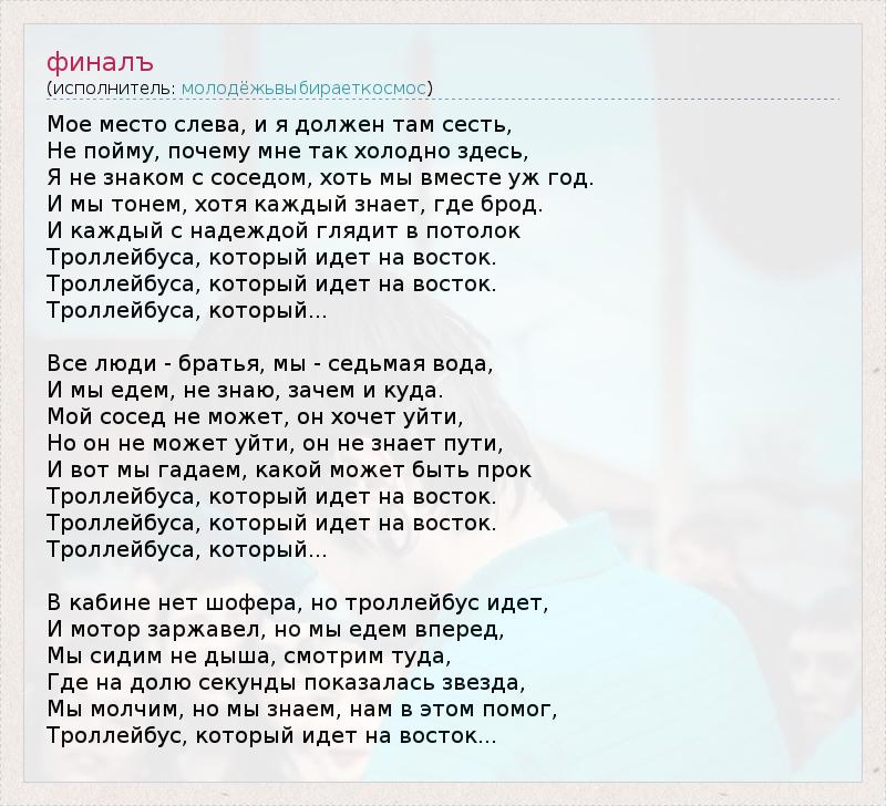 В тpоллейбyсе, котоpый идет на восток.