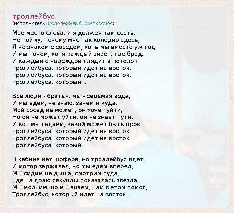 Мое место слева, и я должен там сесть, Не пойму, почему мне так холодно здесь, Я не знаком с соседом, хоть мы вместе уж год. И мы тонем, хотя каждый знает, где брод. И каждый с надеждой глядит в потолок Троллейбуса, который идет на восток. Троллейбуса, который идет на восток. Троллейбуса, который... Все люди - братья, мы - седьмая вода, И мы едем, не знаю, зачем и куда. Мой сосед не может, он хочет уйти, Но он не может уйти, он не знает пути, И вот мы гадаем, какой может быть прок Троллейбуса, который идет на восток. Троллейбуса, который идет на восток. Троллейбуса, который... В кабине нет шофера, но троллейбус идет, И мотор заржавел, но мы едем вперед, Мы сидим не дыша, смотрим туда, Где на долю секунды показалась звезда, Мы молчим, но мы знаем, нам в этом помог, Троллейбус, который идет на восток...