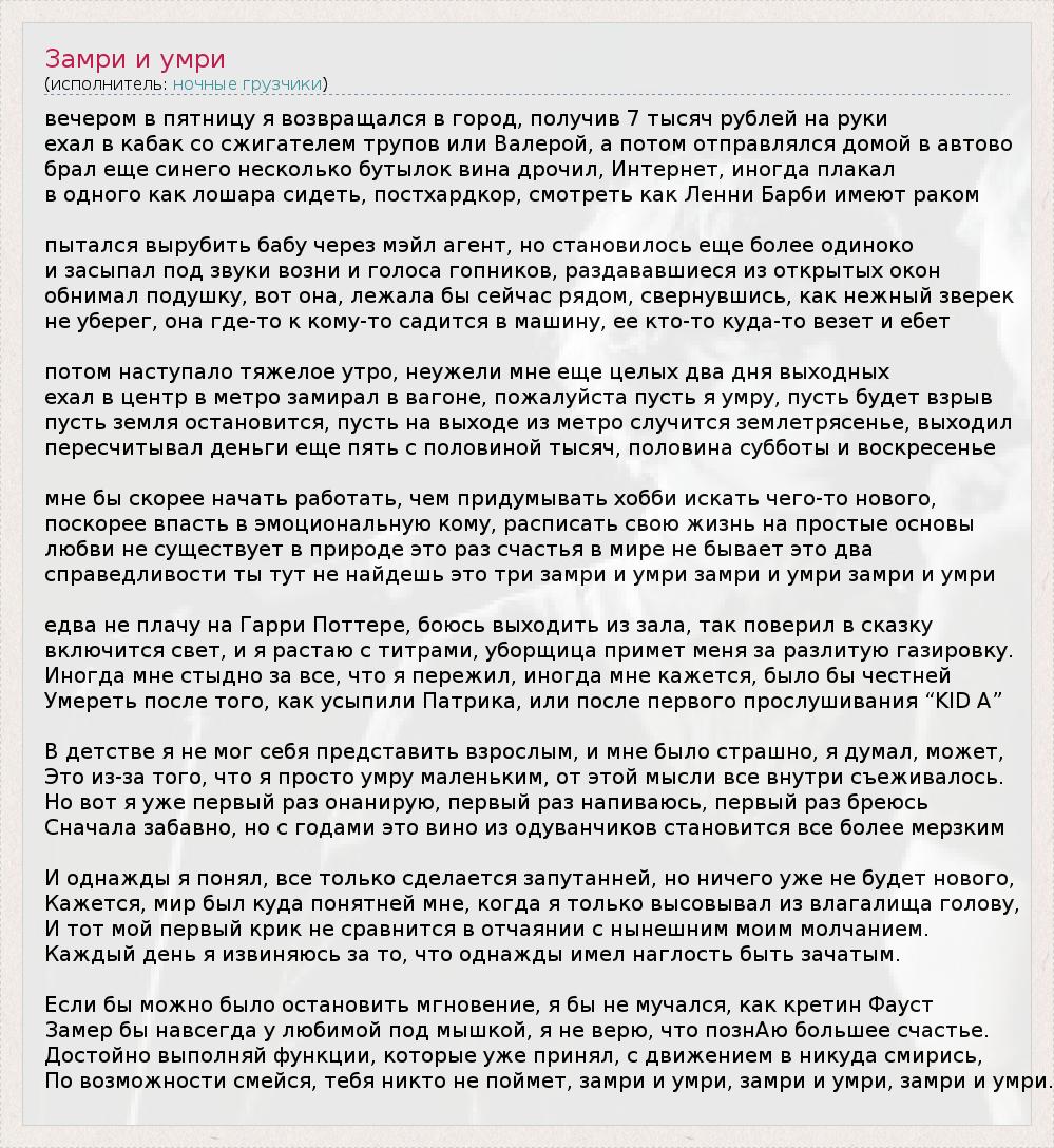 вечером в пятницу я возвращался в город, получив 7 тысяч рублей на руки ехал в кабак со сжигателем трупов или Валерой, а потом отправлялся домой в автово брал еще синего несколько бутылок вина дрочил, Интернет, иногда плакал в одного как лошара сидеть, постхардкор, смотреть как Ленни Барби имеют раком пытался вырубить бабу через мэйл агент, но становилось еще более одиноко и засыпал под звуки возни и голоса гопников, раздававшиеся из открытых окон обнимал подушку, вот она, лежала бы сейчас рядом, свернувшись, как нежный зверек не уберег, она где-то к кому-то садится в машину, ее кто-то куда-то везет и ебет потом наступало тяжелое утро, неужели мне еще целых два дня выходных ехал в центр в метро замирал в вагоне, пожалуйста пусть я умру, пусть будет взрыв пусть земля остановится, пусть на выходе из метро случится землетрясенье, выходил пересчитывал деньги еще пять с половиной тысяч, половина субботы и воскресенье мне бы скорее начать работать, чем придумывать хобби искать чего-то нового, поскорее впасть в эмоциональную кому, расписать свою жизнь на простые основы любви не существует в природе это раз счастья в мире не бывает это два справедливости ты тут не найдешь это три замри и умри замри и умри замри и умри едва не плачу на Гарри Поттере, боюсь выходить из зала, так поверил в сказку включится свет, и я растаю с титрами, уборщица примет меня за разлитую газировку. Иногда мне стыдно за все, что я пережил, иногда мне кажется, было бы честней Умереть после того, как усыпили Патрика, или после первого прослушивания “KID A” В детстве я не мог себя представить взрослым, и мне было страшно, я думал, может, Это из-за того, что я просто умру маленьким, от этой мысли все внутри съеживалось. Но вот я уже первый раз онанирую, первый раз напиваюсь, первый раз бреюсь Сначала забавно, но с годами это вино из одуванчиков становится все более мерзким И однажды я понял, все только сделается запутанней, но ничего уже не будет нового, Кажется, мир был куда понятней мне, когда я только высовывал из влагалища голову, И тот мой первый крик не сравнится в отчаянии с нынешним моим молчанием. Каждый день я извиняюсь за то, что однажды имел наглость быть зачатым. Если бы можно было остановить мгновение, я бы не мучался, как кретин Фауст Замер бы навсегда у любимой под мышкой, я не верю, что познАю большее счастье. Достойно выполняй функции, которые уже принял, с движением в никуда смирись, По возможности смейся, тебя никто не поймет, замри и умри, замри и умри, замри и умри.