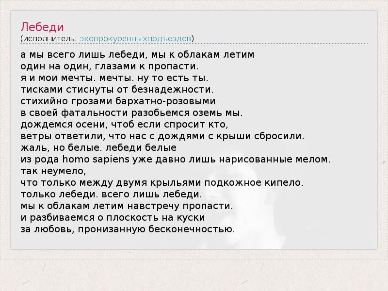 а мы всего лишь лебеди, мы к облакам летим один на один, глазами к пропасти. я и мои мечты. мечты. ну то есть ты. тисками стиснуты от безнадежности. стихийно грозами бархатно-розовыми в своей фатальности разобьемся оземь мы. дождемся осени, чтоб если спросит кто, ветры ответили, что нас с дождями с крыши сбросили. жаль, но белые. лебеди белые из рода homo sapiens уже давно лишь нарисованные мелом. так неумело, что только между двумя крыльями подкожное кипело. только лебеди. всего лишь лебеди. мы к облакам летим навстречу пропасти. и разбиваемся о плоскость на куски за любовь, пронизанную бесконечностью.