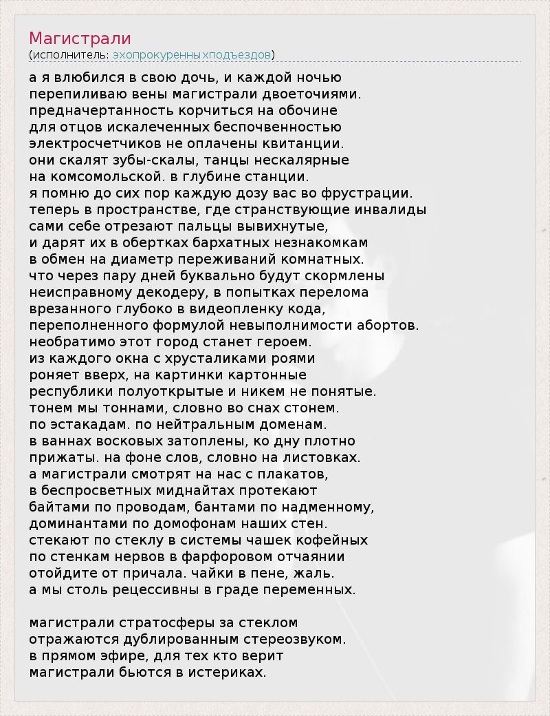 а я влюбился в свою дочь, и каждой ночью перепиливаю вены магистрали двоеточиями. предначертанность корчиться на обочине для отцов искалеченных беспочвенностью электросчетчиков не оплачены квитанции. они скалят зубы-скалы, танцы нескалярные на комсомольской. в глубине станции. я помню до сих пор каждую дозу вас во фрустрации. теперь в пространстве, где странствующие инвалиды сами себе отрезают пальцы вывихнутые, и дарят их в обертках бархатных незнакомкам в обмен на диаметр переживаний комнатных. что через пару дней буквально будут скормлены неисправному декодеру, в попытках перелома врезанного глубоко в видеопленку кода, переполненного формулой невыполнимости абортов. необратимо этот город станет героем. из каждого окна с хрусталиками роями роняет вверх, на картинки картонные республики полуоткрытые и никем не понятые. тонем мы тоннами, словно во снах стонем. по эстакадам. по нейтральным доменам. в ваннах восковых затоплены, ко дну плотно прижаты. на фоне слов, словно на листовках. а магистрали смотрят на нас с плакатов, в беспросветных миднайтах протекают байтами по проводам, бантами по надменному, доминантами по домофонам наших стен. стекают по стеклу в системы чашек кофейных по стенкам нервов в фарфоровом отчаянии отойдите от причала. чайки в пене, жаль. а мы столь рецессивны в граде переменных. магистрали стратосферы за стеклом отражаются дублированным стереозвуком. в прямом эфире, для тех кто верит магистрали бьются в истериках.