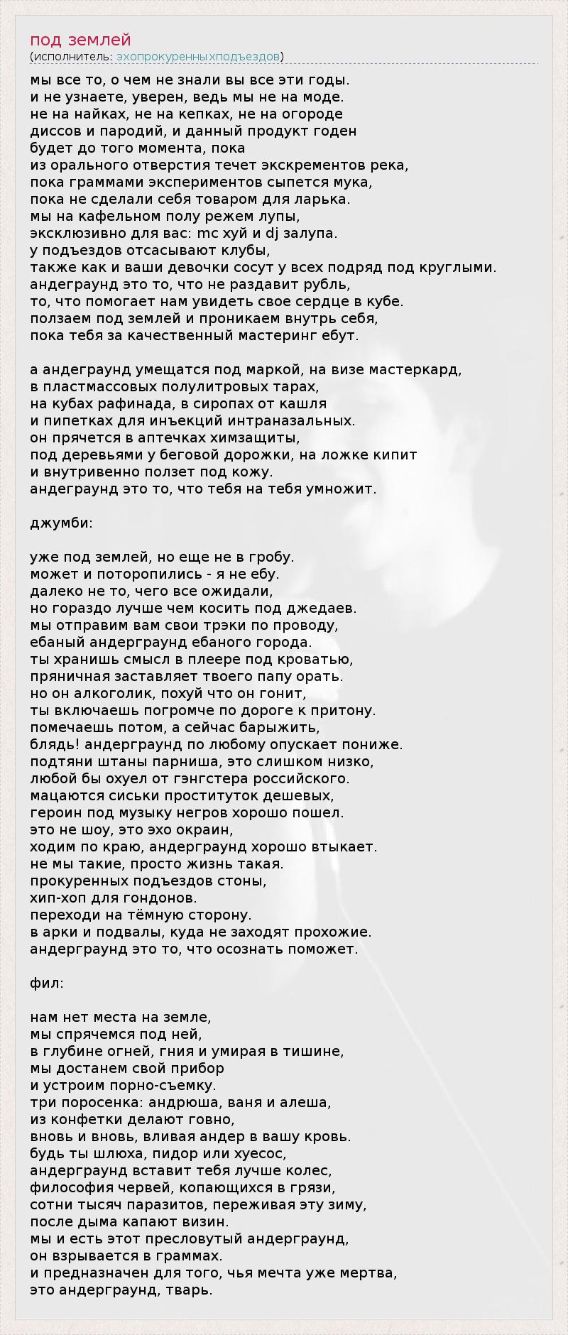 Это интересно:VKЭкспериментальный околоабстрактный хип-хоп от молодого парня из Мурманска.2011 - счастье (Скачать)2011 - зимний... продолжение