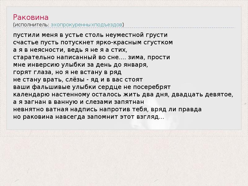 Это интересно:VKЭкспериментальный околоабстрактный хип-хоп от молодого парня из Мурманска.2011 - счастье (Скачать)2011 - зимний... продолжение