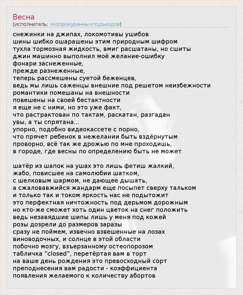 Это интересно:VKЭкспериментальный околоабстрактный хип-хоп от молодого парня из Мурманска.2011 - счастье (Скачать)2011 - зимний... продолжение