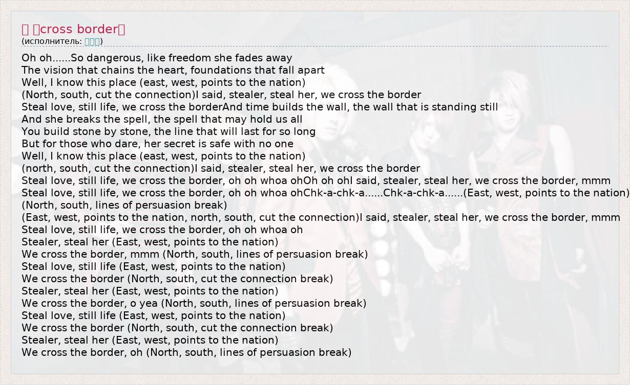 Oh oh......So dangerous, like freedom she fades away The vision that chains the heart, foundations that fall apart Well, I know this place (east, west, points to the nation) (North, south, cut the connection)I said, stealer, steal her, we cross the border Steal love, still life, we cross the borderAnd time builds the wall, the wall that is standing still And she breaks the spell, the spell that may hold us all You build stone by stone, the line that will last for so long But for those who dare, her secret is safe with no one Well, I know this place (east, west, points to the nation) (north, south, cut the connection)I said, stealer, steal her, we cross the border Steal love, still life, we cross the border, oh oh whoa ohOh oh ohI said, stealer, steal her, we cross the border, mmm Steal love, still life, we cross the border, oh oh whoa ohChk-a-chk-a......Chk-a-chk-a......(East, west, points to the nation) (North, south, lines of persuasion break) (East, west, points to the nation, north, south, cut the connection)I said, stealer, steal her, we cross the border, mmm Steal love, still life, we cross the border, oh oh whoa oh Stealer, steal her (East, west, points to the nation) We cross the border, mmm (North, south, lines of persuasion break) Steal love, still life (East, west, points to the nation) We cross the border (North, south, cut the connection break) Stealer, steal her (East, west, points to the nation) We cross the border, o yea (North, south, lines of persuasion break) Steal love, still life (East, west, points to the nation) We cross the border (North, south, cut the connection break) Stealer, steal her (East, west, points to the nation) We cross the border, oh (North, south, lines of persuasion break)