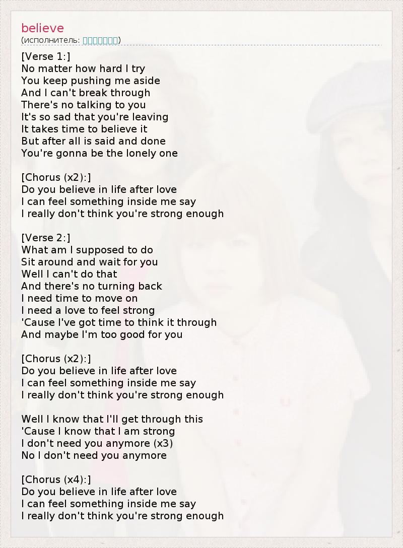 [Verse 1:] No matter how hard I try You keep pushing me aside And I can't break through There's no talking to you It's so sad that you're leaving It takes time to believe it But after all is said and done You're gonna be the lonely one [Chorus (x2):] Do you believe in life after love I can feel something inside me say I really don't think you're strong enough [Verse 2:] What am I supposed to do Sit around and wait for you Well I can't do that And there's no turning back I need time to move on I need a love to feel strong 'Cause I've got time to think it through And maybe I'm too good for you [Chorus (x2):] Do you believe in life after love I can feel something inside me say I really don't think you're strong enough Well I know that I'll get through this 'Cause I know that I am strong I don't need you anymore (x3) No I don't need you anymore [Chorus (x4):] Do you believe in life after love I can feel something inside me say I really don't think you're strong enough