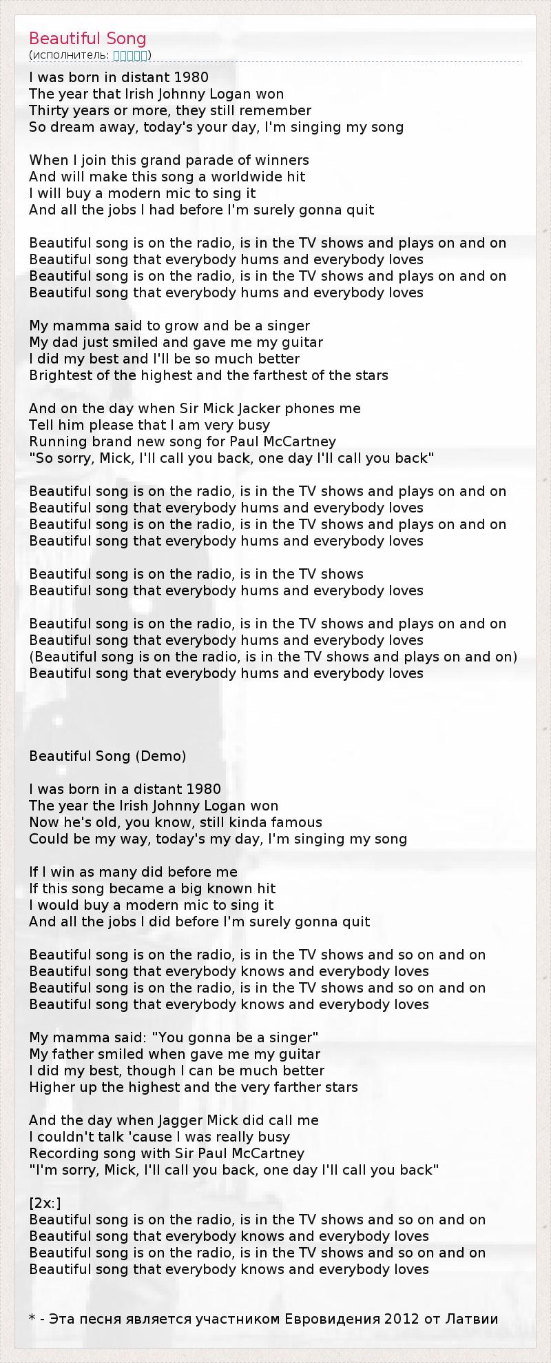 I was born in distant 1980 The year that Irish Johnny Logan won Thirty years or more, they still remember So dream away, today's your day, I'm singing my song When I join this grand parade of winners And will make this song a worldwide hit I will buy a modern mic to sing it And all the jobs I had before I'm surely gonna quit Beautiful song is on the radio, is in the TV shows and plays on and on Beautiful song that everybody hums and everybody loves Beautiful song is on the radio, is in the TV shows and plays on and on Beautiful song that everybody hums and everybody loves My mamma said to grow and be a singer My dad just smiled and gave me my guitar I did my best and I'll be so much better Brightest of the highest and the farthest of the stars And on the day when Sir Mick Jacker phones me Tell him please that I am very busy Running brand new song for Paul McCartney "So sorry, Mick, I'll call you back, one day I'll call you back" Beautiful song is on the radio, is in the TV shows and plays on and on Beautiful song that everybody hums and everybody loves Beautiful song is on the radio, is in the TV shows and plays on and on Beautiful song that everybody hums and everybody loves Beautiful song is on the radio, is in the TV shows Beautiful song that everybody hums and everybody loves Beautiful song is on the radio, is in the TV shows and plays on and on Beautiful song that everybody hums and everybody loves (Beautiful song is on the radio, is in the TV shows and plays on and on) Beautiful song that everybody hums and everybody loves Beautiful Song (Demo) I was born in a distant 1980 The year the Irish Johnny Logan won Now he's old, you know, still kinda famous Could be my way, today's my day, I'm singing my song If I win as many did before me If this song became a big known hit I would buy a modern mic to sing it And all the jobs I did before I'm surely gonna quit Beautiful song is on the radio, is in the TV shows and so on and on Beautiful song that everybody knows and everybody loves Beautiful song is on the radio, is in the TV shows and so on and on Beautiful song that everybody knows and everybody loves My mamma said: "You gonna be a singer" My father smiled when gave me my guitar I did my best, though I can be much better Higher up the highest and the very farther stars And the day when Jagger Mick did call me I couldn't talk 'cause I was really busy Recording song with Sir Paul McCartney "I'm sorry, Mick, I'll call you back, one day I'll call you back" [2x:] Beautiful song is on the radio, is in the TV shows and so on and on Beautiful song that everybody knows and everybody loves Beautiful song is on the radio, is in the TV shows and so on and on Beautiful song that everybody knows and everybody loves * - Эта песня является участником Евровидения 2012 от Латвии