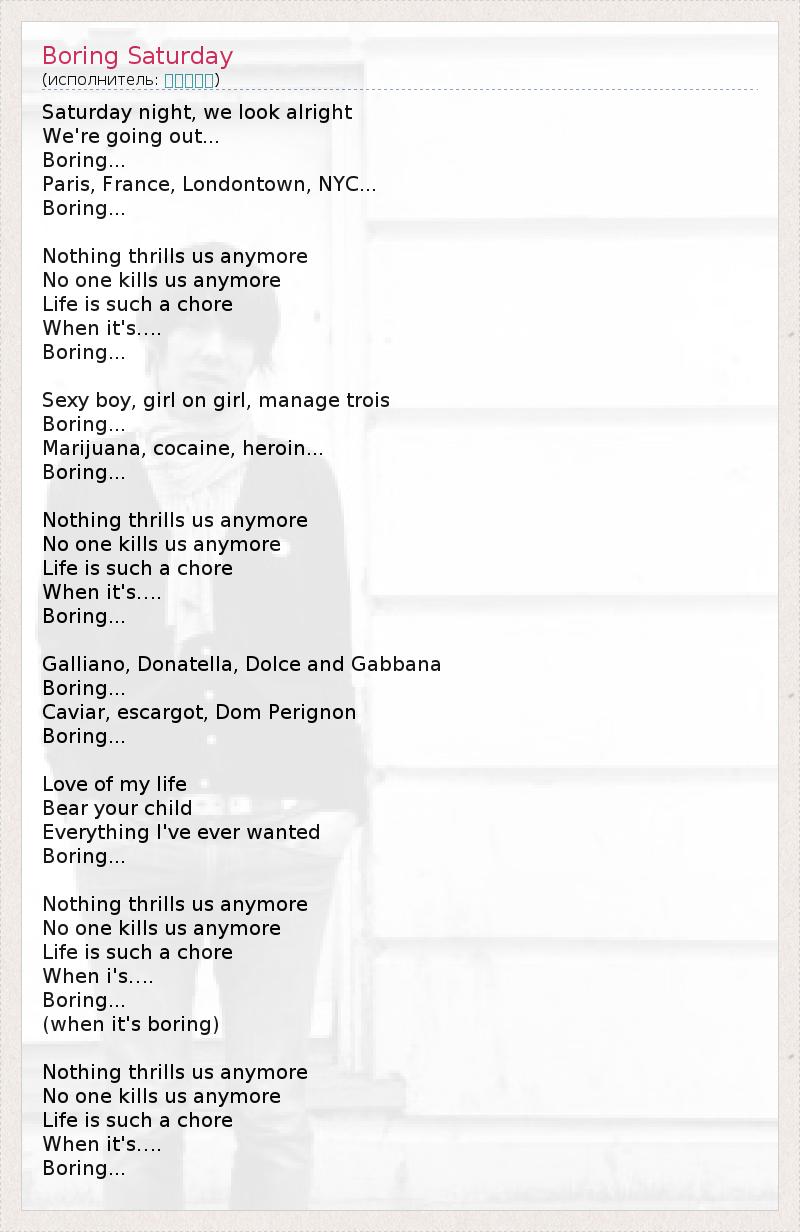Saturday night, we look alright We're going out... Boring... Paris, France, Londontown, NYC... Boring... Nothing thrills us anymore No one kills us anymore Life is such a chore When it's…. Boring... Sexy boy, girl on girl, manage trois Boring... Marijuana, cocaine, heroin... Boring... Nothing thrills us anymore No one kills us anymore Life is such a chore When it's…. Boring... Galliano, Donatella, Dolce and Gabbana Boring... Caviar, escargot, Dom Perignon Boring... Love of my life Bear your child Everything I've ever wanted Boring... Nothing thrills us anymore No one kills us anymore Life is such a chore When i's…. Boring... (when it's boring) Nothing thrills us anymore No one kills us anymore Life is such a chore When it's…. Boring...