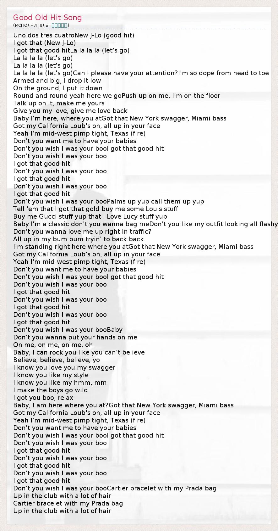 Uno dos tres cuatroNew J-Lo (good hit) I got that (New J-Lo) I got that good hitLa la la la (let's go) La la la la (let's go) La la la la (let's go) La la la la (let's go)Can I please have your attention?I'm so dope from head to toe Armed and big, I drop it low On the ground, I put it down Round and round yeah here we goPush up on me, I'm on the floor Talk up on it, make me yours Give you my love, give me love back Baby I'm here, where you atGot that New York swagger, Miami bass Got my California Loub's on, all up in your face Yeah I'm mid-west pimp tight, Texas (fire) Don't you want me to have your babies Don't you wish I was your booI got that good hit Don't you wish I was your boo I got that good hit Don't you wish I was your boo I got that good hit Don't you wish I was your boo I got that good hit Don't you wish I was your booPalms up yup call them up yup Tell 'em that I got that gold buy me some Louis stuff Buy me Gucci stuff yup that I Love Lucy stuff yup Baby I'm a classic don't you wanna bag meDon't you like my outfit looking all flashy Don't you wanna love me up right in traffic? All up in my bum bum tryin' to back back I'm standing right here where you atGot that New York swagger, Miami bass Got my California Loub's on, all up in your face Yeah I'm mid-west pimp tight, Texas (fire) Don't you want me to have your babies Don't you wish I was your booI got that good hit Don't you wish I was your boo I got that good hit Don't you wish I was your boo I got that good hit Don't you wish I was your boo I got that good hit Don't you wish I was your booBaby Don't you wanna put your hands on me On me, on me, on me, oh Baby, I can rock you like you can't believe Believe, believe, believe, yo I know you love you my swagger I know you like my style I know you like my hmm, mm I make the boys go wild I got you boo, relax Baby, I am here where you at?Got that New York swagger, Miami bass Got my California Loub's on, all up in your face Yeah I'm mid-west pimp tight, Texas (fire) Don't you want me to have your babies Don't you wish I was your booI got that good hit Don't you wish I was your boo I got that good hit Don't you wish I was your boo I got that good hit Don't you wish I was your boo I got that good hit Don't you wish I was your booCartier bracelet with my Prada bag Up in the club with a lot of hair Cartier bracelet with my Prada bag Up in the club with a lot of hair