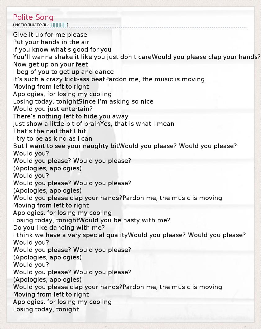 Give it up for me please Put your hands in the air If you know what's good for you You'll wanna shake it like you just don't careWould you please clap your hands? Now get up on your feet I beg of you to get up and dance It's such a crazy kick-ass beatPardon me, the music is moving Moving from left to right Apologies, for losing my cooling Losing today, tonightSince I'm asking so nice Would you just entertain? There's nothing left to hide you away Just show a little bit of brainYes, that is what I mean That's the nail that I hit I try to be as kind as I can But I want to see your naughty bitWould you please? Would you please? Would you? Would you please? Would you please? (Apologies, apologies) Would you? Would you please? Would you please? (Apologies, apologies) Would you please clap your hands?Pardon me, the music is moving Moving from left to right Apologies, for losing my cooling Losing today, tonightWould you be nasty with me? Do you like dancing with me? I think we have a very special qualityWould you please? Would you please? Would you? Would you please? Would you please? (Apologies, apologies) Would you? Would you please? Would you please? (Apologies, apologies) Would you please clap your hands?Pardon me, the music is moving Moving from left to right Apologies, for losing my cooling Losing today, tonight