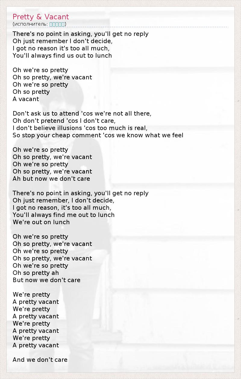 There's no point in asking, you'll get no reply Oh just remember I don't decide, I got no reason it's too all much, You'll always find us out to lunch Oh we're so pretty Oh so pretty, we're vacant Oh we're so pretty Oh so pretty A vacant Don't ask us to attend 'cos we're not all there, Oh don't pretend 'cos I don't care, I don't believe illusions 'cos too much is real, So stop your cheap comment 'cos we know what we feel Oh we're so pretty Oh so pretty, we're vacant Oh we're so pretty Oh so pretty, we're vacant Ah but now we don't care There's no point in asking, you'll get no reply Oh just remember, I don't decide, I got no reason, it's too all much, You'll always find me out to lunch We're out on lunch Oh we're so pretty Oh so pretty, we're vacant Oh we're so pretty Oh so pretty, we're vacant Oh we're so pretty Oh so pretty ah But now we don't care We're pretty A pretty vacant We're pretty A pretty vacant We're pretty A pretty vacant We're pretty A pretty vacant And we don't care