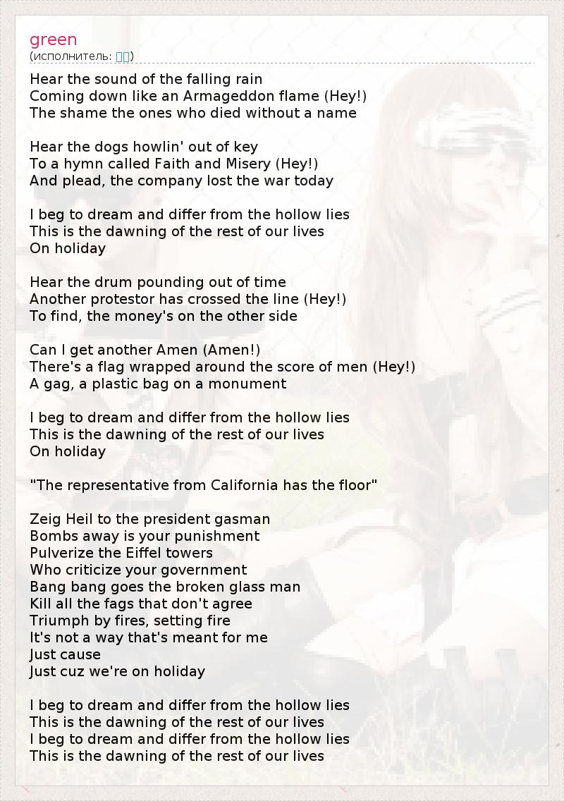 Hear the sound of the falling rain Coming down like an Armageddon flame (Hey!) The shame the ones who died without a name Hear the dogs howlin' out of key To a hymn called Faith and Misery (Hey!) And plead, the company lost the war today I beg to dream and differ from the hollow lies This is the dawning of the rest of our lives On holiday Hear the drum pounding out of time Another protestor has crossed the line (Hey!) To find, the money's on the other side Can I get another Amen (Amen!) There's a flag wrapped around the score of men (Hey!) A gag, a plastic bag on a monument I beg to dream and differ from the hollow lies This is the dawning of the rest of our lives On holiday "The representative from California has the floor" Zeig Heil to the president gasman Bombs away is your punishment Pulverize the Eiffel towers Who criticize your government Bang bang goes the broken glass man Kill all the fags that don't agree Triumph by fires, setting fire It's not a way that's meant for me Just cause Just cuz we're on holiday I beg to dream and differ from the hollow lies This is the dawning of the rest of our lives I beg to dream and differ from the hollow lies This is the dawning of the rest of our lives