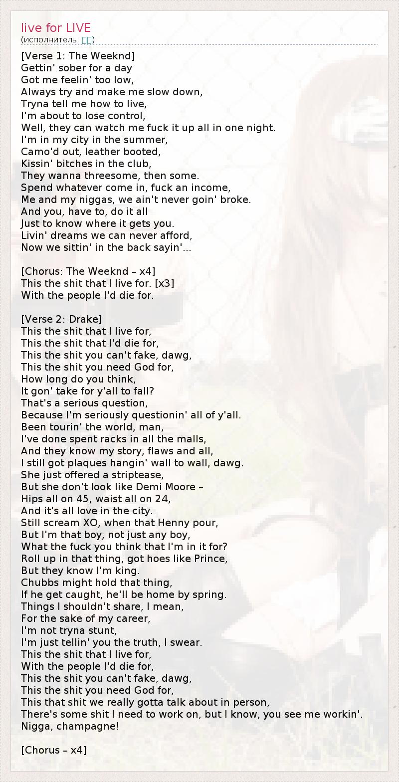 [Verse 1: The Weeknd] Gettin' sober for a day Got me feelin' too low, Always try and make me slow down, Tryna tell me how to live, I'm about to lose control, Well, they can watch me fuck it up all in one night. I'm in my city in the summer, Camo'd out, leather booted, Kissin' bitches in the club, They wanna threesome, then some. Spend whatever come in, fuck an income, Me and my niggas, we ain't never goin' broke. And you, have to, do it all Just to know where it gets you. Livin' dreams we can never afford, Now we sittin' in the back sayin'... [Chorus: The Weeknd – x4] This the shit that I live for. [x3] With the people I'd die for. [Verse 2: Drake] This the shit that I live for, This the shit that I'd die for, This the shit you can't fake, dawg, This the shit you need God for, How long do you think, It gon' take for y'all to fall? That's a serious question, Because I'm seriously questionin' all of y'all. Been tourin' the world, man, I've done spent racks in all the malls, And they know my story, flaws and all, I still got plaques hangin' wall to wall, dawg. She just offered a striptease, But she don't look like Demi Moore – Hips all on 45, waist all on 24, And it's all love in the city. Still scream XO, when that Henny pour, But I'm that boy, not just any boy, What the fuck you think that I'm in it for? Roll up in that thing, got hoes like Prince, But they know I'm king. Chubbs might hold that thing, If he get caught, he'll be home by spring. Things I shouldn't share, I mean, For the sake of my career, I'm not tryna stunt, I'm just tellin' you the truth, I swear. This the shit that I live for, With the people I'd die for, This the shit you can't fake, dawg, This the shit you need God for, This that shit we really gotta talk about in person, There's some shit I need to work on, but I know, you see me workin'. Nigga, champagne! [Chorus – x4]