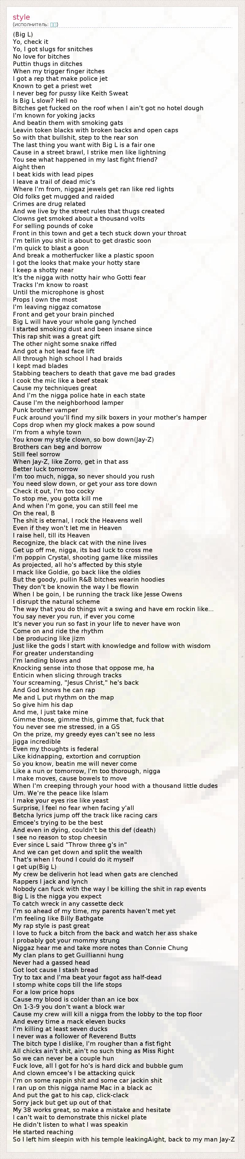 (Big L) Yo, check it Yo, I got slugs for snitches No love for bitches Puttin thugs in ditches When my trigger finger itches I got a rep that make police jet Known to get a priest wet I never beg for pussy like Keith Sweat Is Big L slow? Hell no Bitches get fucked on the roof when I ain't got no hotel dough I'm known for yoking jacks And beatin them with smoking gats Leavin token blacks with broken backs and open caps So with that bullshit, step to the rear son The last thing you want with Big L is a fair one Cause in a street brawl, I strike men like lightning You see what happened in my last fight friend? Aight then I beat kids with lead pipes I leave a trail of dead mic's Where I'm from, niggaz jewels get ran like red lights Old folks get mugged and raided Crimes are drug related And we live by the street rules that thugs created Clowns get smoked about a thousand volts For selling pounds of coke Front in this town and get a tech stuck down your throat I'm tellin you shit is about to get drastic soon I'm quick to blast a goon And break a motherfucker like a plastic spoon I got the looks that make your hotty stare I keep a shotty near It's the nigga with notty hair who Gotti fear Tracks I'm know to roast Until the microphone is ghost Props I own the most I'm leaving niggaz comatose Front and get your brain pinched Big L will have your whole gang lynched I started smoking dust and been insane since This rap shit was a great gift The other night some snake riffed And got a hot lead face lift All through high school I had braids I kept mad blades Stabbing teachers to death that gave me bad grades I cook the mic like a beef steak Cause my techniques great And I'm the nigga police hate in each state Cause I'm the neighborhood lamper Punk brother vamper Fuck around you'll find my silk boxers in your mother's hamper Cops drop when my glock makes a pow sound I'm from a whyle town You know my style clown, so bow down(Jay-Z) Brothers can beg and borrow Still feel sorrow When Jay-Z, like Zorro, get in that ass Better luck tomorrow I'm too much, nigga, so never should you rush You need slow down, or get your ass tore down Check it out, I'm too cocky To stop me, you gotta kill me And when I'm gone, you can still feel me On the real, B The shit is eternal, I rock the Heavens well Even if they won't let me in Heaven I raise hell, till its Heaven Recognize, the black cat with the nine lives Get up off me, nigga, its bad luck to cross me I'm poppin Crystal, shooting game like missiles As projected, all ho's affected by this style I mack like Goldie, go back like the oldies But the goody, pullin R&B bitches wearin hoodies They don't be knowin the way I be flowin When I be goin, I be running the track like Jesse Owens I disrupt the natural scheme The way that you do things wit a swing and have em rockin like... You say never you run, if ever you come It's never you run so fast in your life to never have won Come on and ride the rhythm I be producing like jizm Just like the gods I start with knowledge and follow with wisdom For greater understanding I'm landing blows and Knocking sense into those that oppose me, ha Enticin when slicing through tracks Your screaming, "Jesus Christ," he's back And God knows he can rap Me and L put rhythm on the map So give him his dap And me, I just take mine Gimme those, gimme this, gimme that, fuck that You never see me stressed, in a GS On the prize, my greedy eyes can't see no less Jigga incredible Even my thoughts is federal Like kidnapping, extortion and corruption So you know, beatin me will never come Like a nun or tomorrow, I'm too thorough, nigga I make moves, cause bowels to move When I'm creeping through your hood with a thousand little dudes Um. We're the peace like Islam I make your eyes rise like yeast Surprise, I feel no fear when facing y'all Betcha lyrics jump off the track like racing cars Emcee's trying to be the best And even in dying, couldn't be this def (death) I see no reason to stop cheesin Ever since L said "Throw three g's in" And we can get down and split the wealth That's when I found I could do it myself I get up(Big L) My crew be deliverin hot lead when gats are clenched Rappers I jack and lynch Nobody can fuck with the way I be killing the shit in rap events Big L is the nigga you expect To catch wreck in any cassette deck I'm so ahead of my time, my parents haven't met yet I'm feeling like Billy Bathgate My rap style is past great I love to fuck a bitch from the back and watch her ass shake I probably got your mommy strung Niggaz hear me and take more notes than Connie Chung My clan plans to get Guillianni hung Never had a gassed head Got loot cause I stash bread Try to tax and I'ma beat your fagot ass half-dead I stomp white cops till the life stops For a low price hops Cause my blood is colder than an ice box On 1-3-9 you don't want a block war Cause my crew will kill a nigga from the lobby to the top floor And every time a mack eleven bucks I'm killing at least seven ducks I never was a follower of Reverend Butts The bitch type I dislike, I'm rougher than a fist fight All chicks ain't shit, ain't no such thing as Miss Right So we can never be a couple hun Fuck love, all I got for ho's is hard dick and bubble gum And clown emcee's I be attacking quick I'm on some rappin shit and some car jackin shit I ran up on this nigga name Mac in a black ac And put the gat to his cap, click-clack Sorry jack but get up out of that My 38 works great, so make a mistake and hesitate I can't wait to demonstrate this nickel plate He didn't listen to what I was speakin He started reaching So I left him sleepin with his temple leakingAight, back to my man Jay-Z
