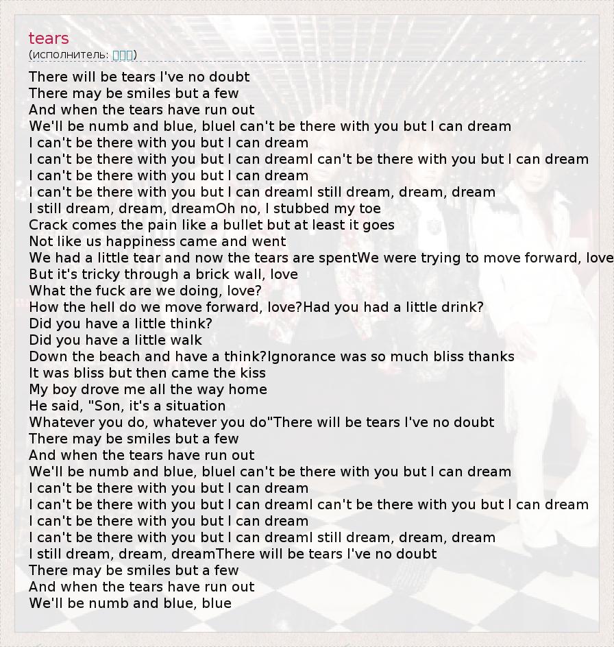 There will be tears I've no doubt There may be smiles but a few And when the tears have run out We'll be numb and blue, blueI can't be there with you but I can dream I can't be there with you but I can dream I can't be there with you but I can dreamI can't be there with you but I can dream I can't be there with you but I can dream I can't be there with you but I can dreamI still dream, dream, dream I still dream, dream, dreamOh no, I stubbed my toe Crack comes the pain like a bullet but at least it goes Not like us happiness came and went We had a little tear and now the tears are spentWe were trying to move forward, love But it's tricky through a brick wall, love What the fuck are we doing, love? How the hell do we move forward, love?Had you had a little drink? Did you have a little think? Did you have a little walk Down the beach and have a think?Ignorance was so much bliss thanks It was bliss but then came the kiss My boy drove me all the way home He said, "Son, it's a situation Whatever you do, whatever you do"There will be tears I've no doubt There may be smiles but a few And when the tears have run out We'll be numb and blue, blueI can't be there with you but I can dream I can't be there with you but I can dream I can't be there with you but I can dreamI can't be there with you but I can dream I can't be there with you but I can dream I can't be there with you but I can dreamI still dream, dream, dream I still dream, dream, dreamThere will be tears I've no doubt There may be smiles but a few And when the tears have run out We'll be numb and blue, blue