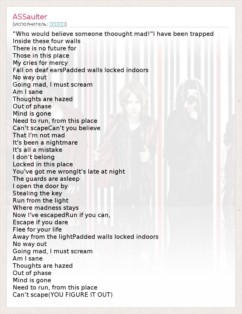 "Who would believe someone thoought mad!"I have been trapped Inside these four walls There is no future for Those in this place My cries for mercy Fall on deaf earsPadded walls locked indoors No way out Going mad, I must scream Am I sane Thoughts are hazed Out of phase Mind is gone Need to run, from this place Can't scapeCan't you believe That I'm not mad It's been a nightmare It's all a mistake I don't belong Locked in this place You've got me wrongIt's late at night The guards are asleep I open the door by Stealing the key Run from the light Where madness stays Now I've escapedRun if you can, Escape if you dare Flee for your life Away from the lightPadded walls locked indoors No way out Going mad, I must scream Am I sane Thoughts are hazed Out of phase Mind is gone Need to run, from this place Can't scape(YOU FIGURE IT OUT)