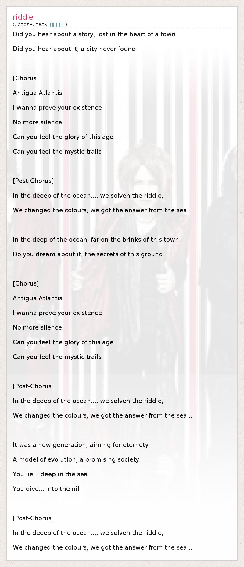 Did you hear about a story, lost in the heart of a town Did you hear about it, a city never found [Chorus] Antigua Atlantis I wanna prove your existence No more silence Can you feel the glory of this age Can you feel the mystic trails [Post-Chorus] In the deeep of the ocean..., we solven the riddle, We changed the colours, we got the answer from the sea... In the deep of the ocean, far on the brinks of this town Do you dream about it, the secrets of this ground [Chorus] Antigua Atlantis I wanna prove your existence No more silence Can you feel the glory of this age Can you feel the mystic trails [Post-Chorus] In the deeep of the ocean..., we solven the riddle, We changed the colours, we got the answer from the sea... It was a new generation, aiming for eternety A model of evolution, a promising society You lie... deep in the sea You dive... into the nil [Post-Chorus] In the deeep of the ocean..., we solven the riddle, We changed the colours, we got the answer from the sea...